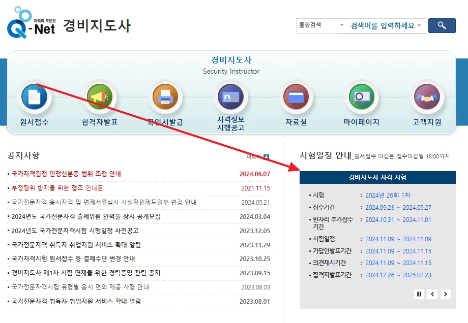 상단 메뉴를 누르셨다면 여러 자격증 리스트가 쭉 나올 텐데요. 여기서 '경비지도사'를 선택해서 들어가시면 전용 페이지로 이동하게 됩니다. 저도 예전에 다른 자격증 때문에 큐넷을 써봤는데, 자격증마다 페이지가 따로 구성되어 있어서 정보 보기가 편하더라고요.